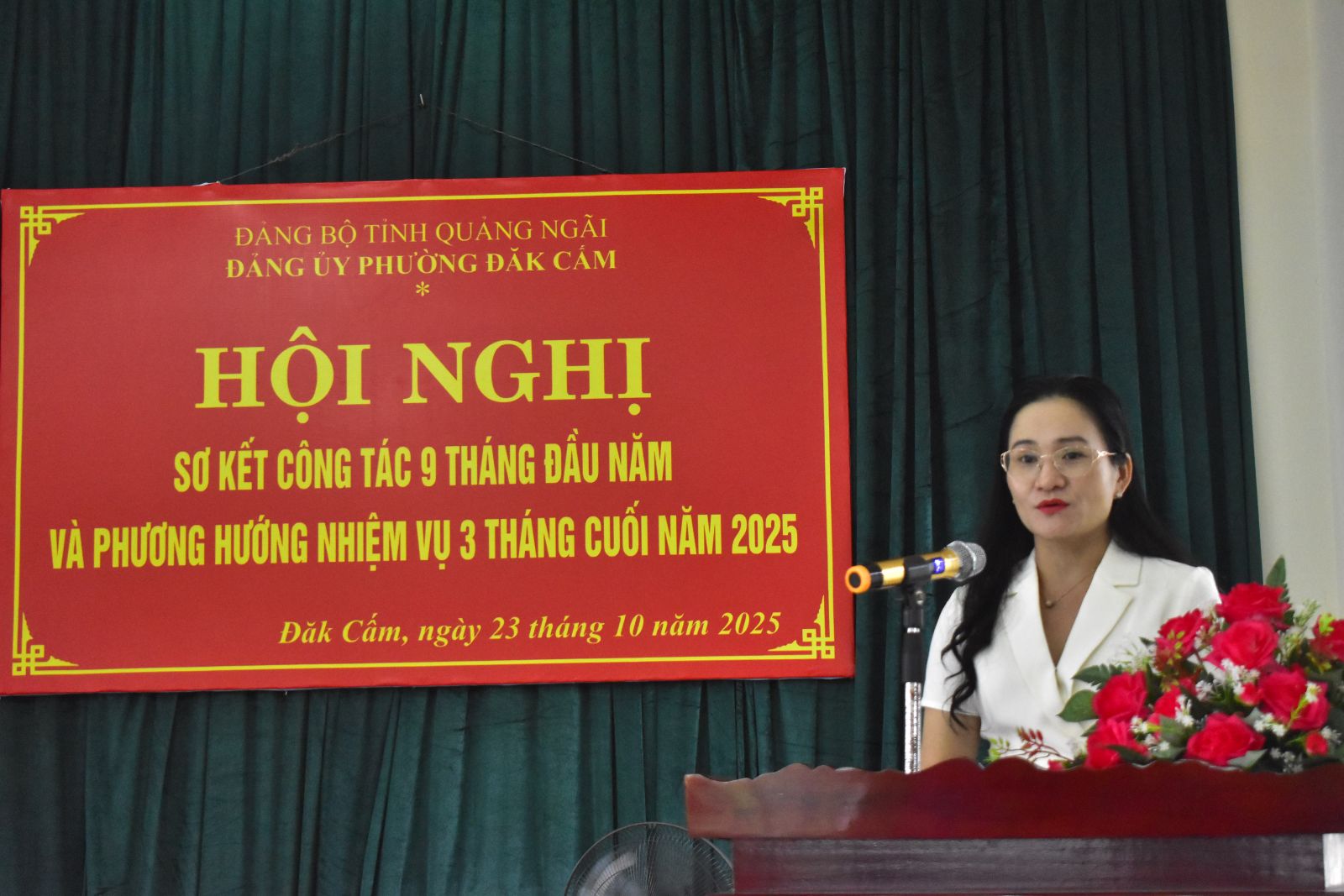 Chiều 23/10, Đảng uỷ phường Đăk Cấm tổ chức Hội nghị sơ kết công tác 9 tháng đầu năm, triển khai nhiệm vụ trọng tâm 3 tháng cuối năm 2025. Dự Hội nghị có đồng chí Ngô Thị Hoàng Anh, Tỉnh ủy viên, Phó Trưởng ban Thường trực Ban Tổ chức Tỉnh ủy, Tổ cấp ủy tỉnh phụ trách địa bàn phường Đăk Cấm. Các đồng chí Dương Quang Phục- Bí thư Đảng uỷ, Chủ tịch HĐND phường; Dương Thị Hạnh- Phó Bí thư Thường trực Đảng uỷ; Nguyễn Xuân Ninh- Phó Bí thư Đảng uỷ, Chủ tịch UBND phường đồng chủ trì Hội nghị.