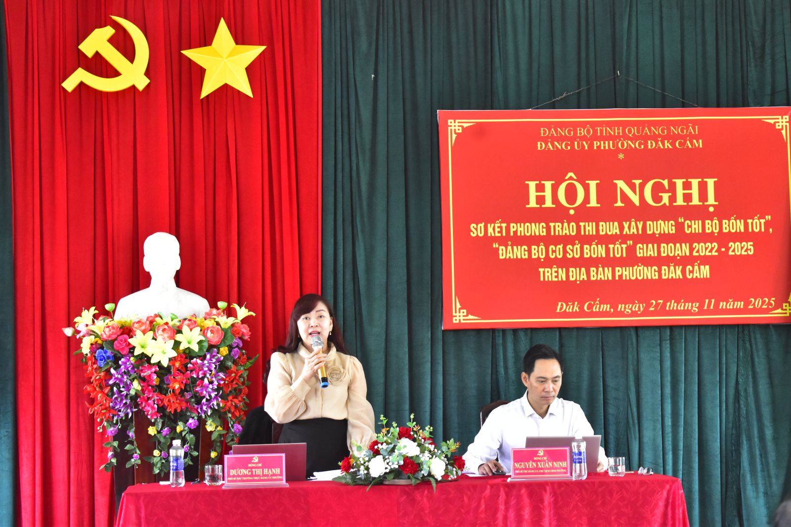 Sáng 27/11, Đảng uỷ phường Đăk Cấm tổ chức sơ kết phong trào thi đua xây dựng “Chi bộ bốn tốt”, “Đảng bộ cơ sở bốn tốt” giai đoạn 2022 - 2025. Các đồng chí: Dương Thị Hạnh - Phó Bí thư Thường trực Đảng uỷ; Nguyễn Xuân Ninh- Phó Bí thư Đảng uỷ, Chủ tịch UBND phường đồng chủ trì Hội nghị.