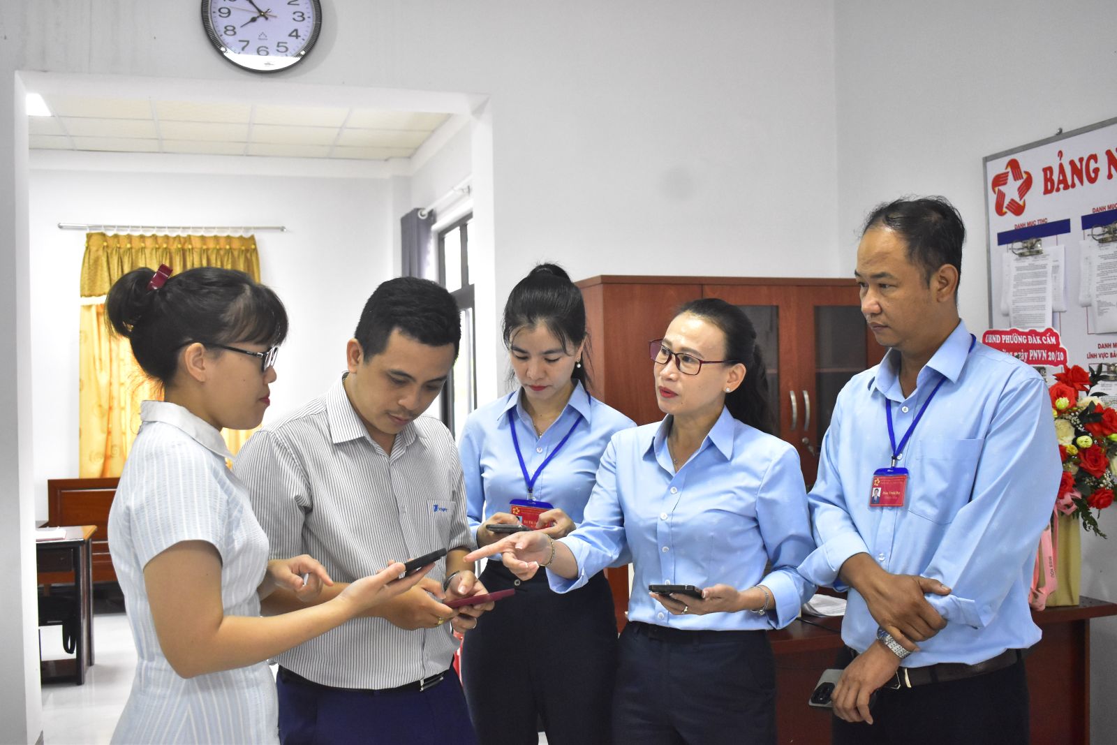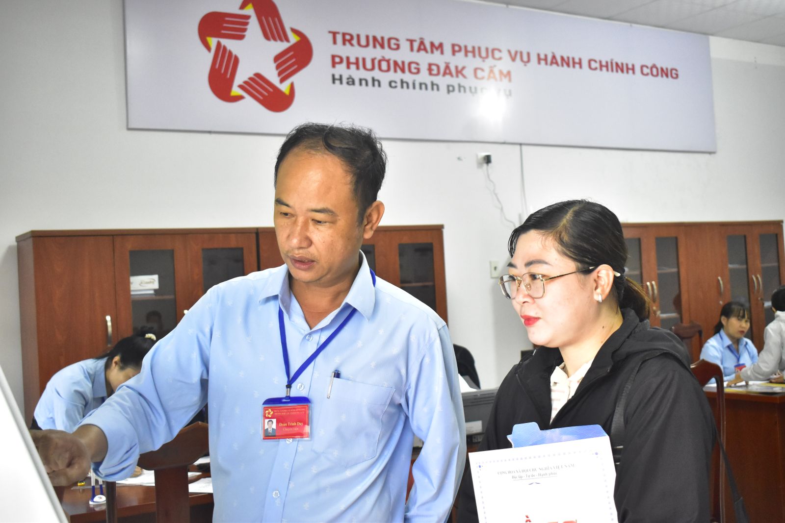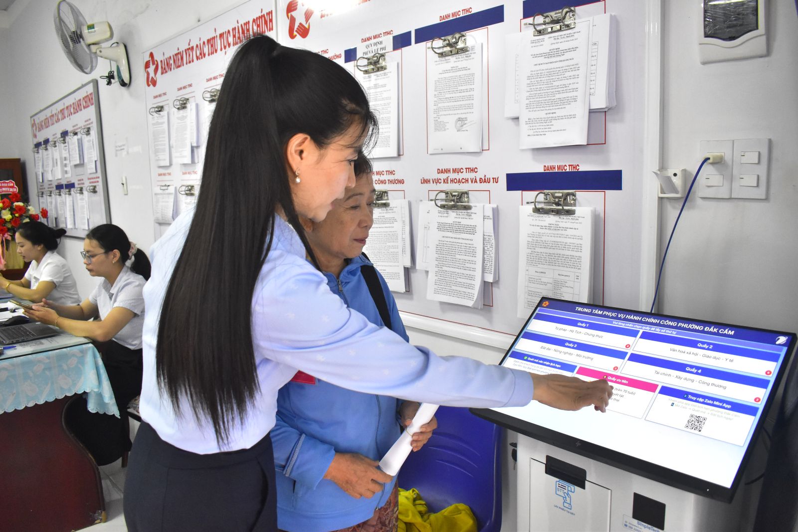 Sáng 24/10, UBND phường Đăk Cấm phối hợp với Trung tâm Kinh doanh giải pháp - VNPT Quảng Ngãi cài đặt ứng dụng đặt lịch hẹn trên kios bốc số tự động tại Trung tâm phục vụ hành chính công phường, đồng thời hướng dẫn CCVC, người dân cách thức sử dụng.