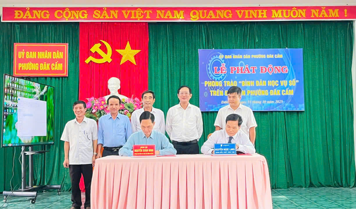 Một trong những điểm nhấn của buổi lễ là nghi thức bấm nút phát động phong trào “Bình dân học vụ số”, với sự tham gia của lãnh đạo Đảng ủy, HĐND, UBND, Ủy ban MTTQ Việt Nam phường và đại diện VNPT Kon Tum. Ngay sau nghi thức bấm nút, hai bên đã tiến hành ký kết quy chế phối hợp thỏa thuận hợp tác về chuyển đổi số trên địa bàn phường Đăk Cấm, giai đoạn 2025 - 2030, với mục tiêu triển khai hiệu quả các nền tảng số, dịch vụ công trực tuyến, góp phần nâng cao chất lượng phục vụ nhân dân và thúc đẩy chính quyền số.